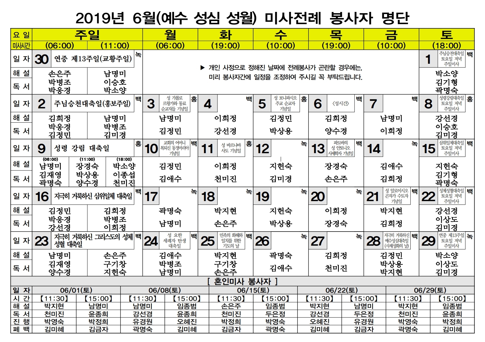 2019년 06월 전례봉사자 명단