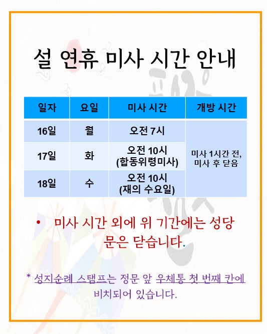 ✣ 월요일은 휴무로 미사 후 성당 문을 닫습니다.